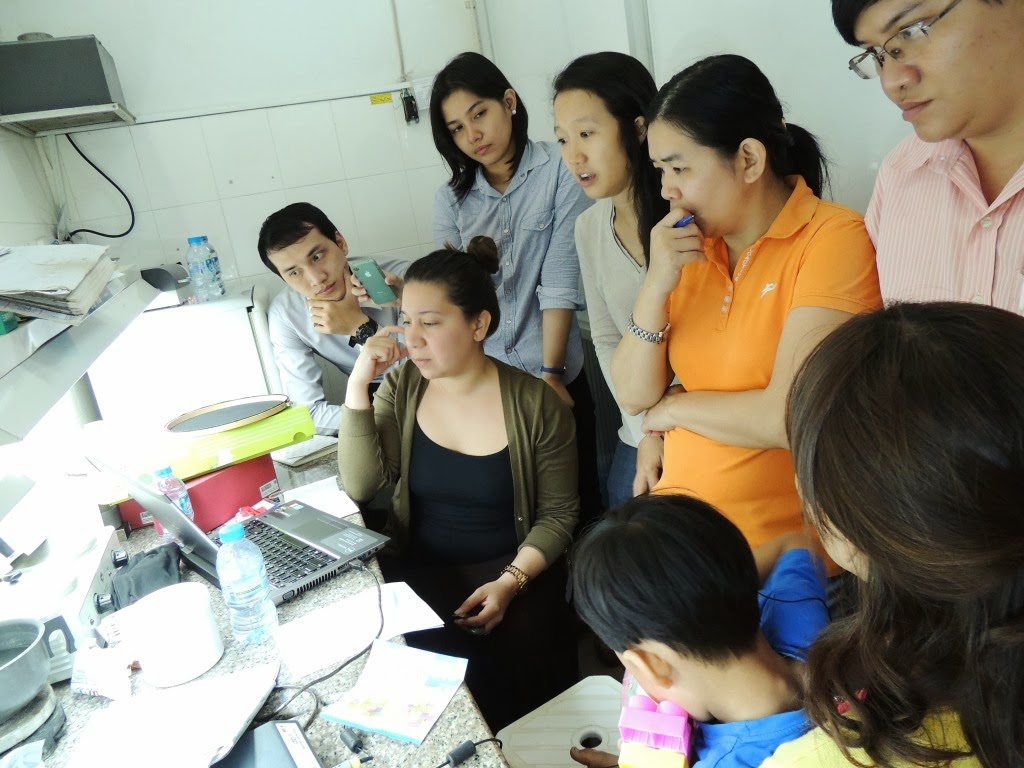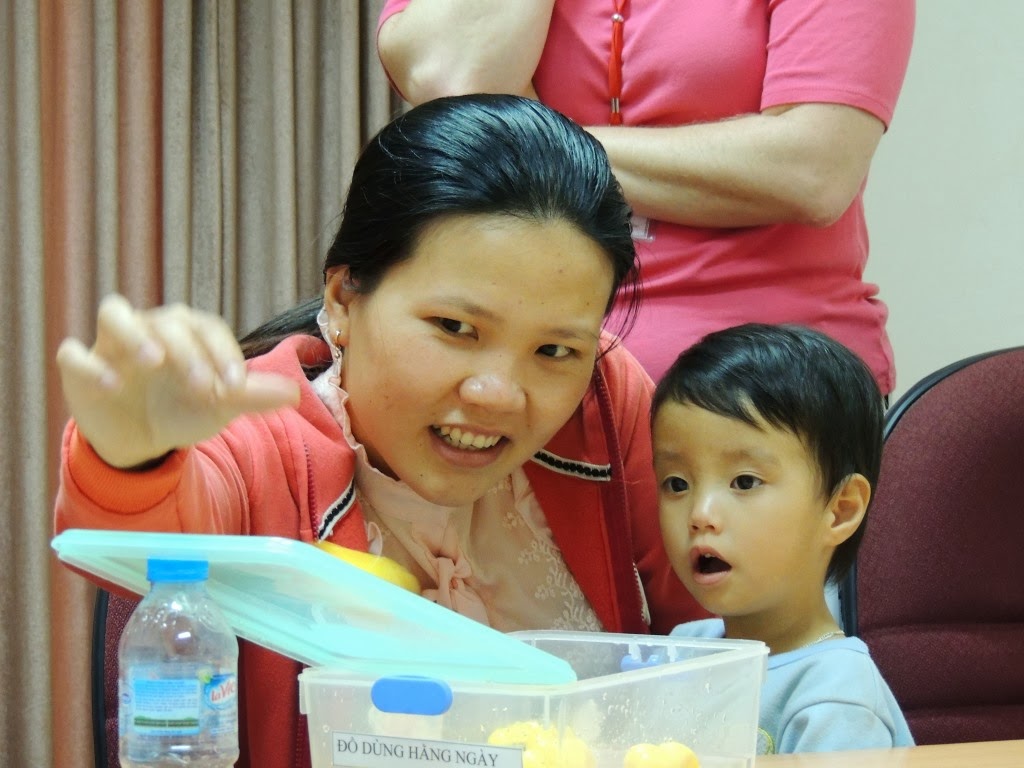 Our first week of Mobile Mission training at Children’s Hospital 1 wraps up today. Sherri Vernelson and Erin Thompson have been working with a group of therapist who are rapidly demonstrating good skills to help children with hearing loss make use of their hearing technology and develop spoken language. These therapists have been enrolled in our program for three years. Each morning this week, little girls in their dresses and young boys in pressed pants would come in with their moms and/or dads to engage in therapy sessions. The Vietnamese led the sessions with the families while receiving feedback and coaching from Erin and Sherri. Time was also devoted to small group discussions about specific topics and strategies and