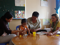 During the first two days of the week, we observed and coached teachers on how to use strategies and involve the parent in the session. We worked with them on using the Integrated Scales of Development to determine what the children needed to learn. We took the time to role play, show them specifically what to do, and brainstorm with them about what children in Vietnam do at home. They discussed how to develop activities with goals centered around what children do at home – and then use those ideas in therapy.