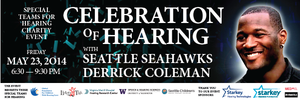 Please join us on Friday May 23 for the Celebration of Hearing with #40 Derrick Coleman and the Seattle Seahawks! We’ll gather from 6:30 pm to 9:30 pm at ROOT Sports Lounge at CenturyLink Field for a party in honor of Derrick’s inspiring story of overcoming odds to become NFL Super Bowl champion in spite of a severe hearing loss. The event benefits Special Teams for Hearing, five Seattle-based nonprofit organizations working in different aspects of the hearing loss field with the overall goal of betterment of life and opportunities for people who are deaf or hard of hearing.