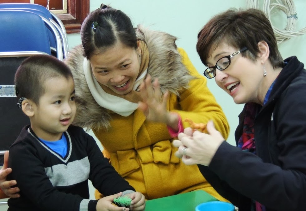 Meanwhile, across town, our auditory-verbal therapy training program continued in its second year with a select group of therapists at Hanoi National University of Education. Erin Thompson and Sherri Vernelson continued the Global Foundation curriculum with a focus on developing speech goals and strategies. Vietnamese therapists led sessions with children under 6 years of age and their parents each morning. During these sessions, Erin and Sherri provided coaching support. Feedback sessions were provided later in the day as well as time for planning activities for the following day’s therapy sessions.