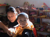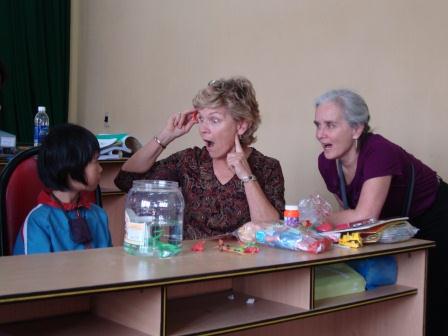 Most teachers of the deaf in Dalat have just basic knowledge of auditory-verbal techniques but there are bright spots. Lam Dong School for the Hearing Impaired has classrooms where young children are encouraged to listen and use their voice to speak. They have about six families that come once a week for auditory-verbal therapy. Judy and Lea corralled these families into a room for an impromptu play group today and encouraged them, the early intervention teacher, and the director of the school to establish such a group ongoing. Play groups are valuable because they foster interaction between teachers and families to further the child’s development as well as provide opportunity for the children to develop social and behavioral skills. Judy and Lea quickly revised the schedule and set up an afternoon of lecture and practicum that catered to this group of early intervention promise. They advised the families and teachers about how they could work together to ensure the children develop auditory language throughout the day, both at home and at school.